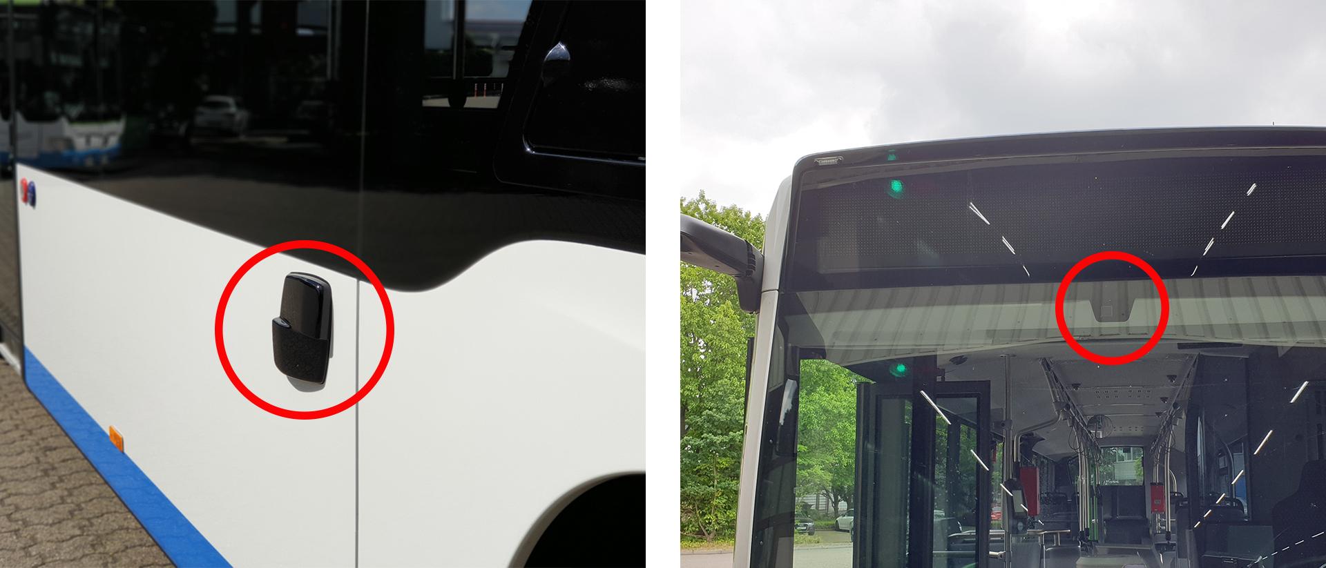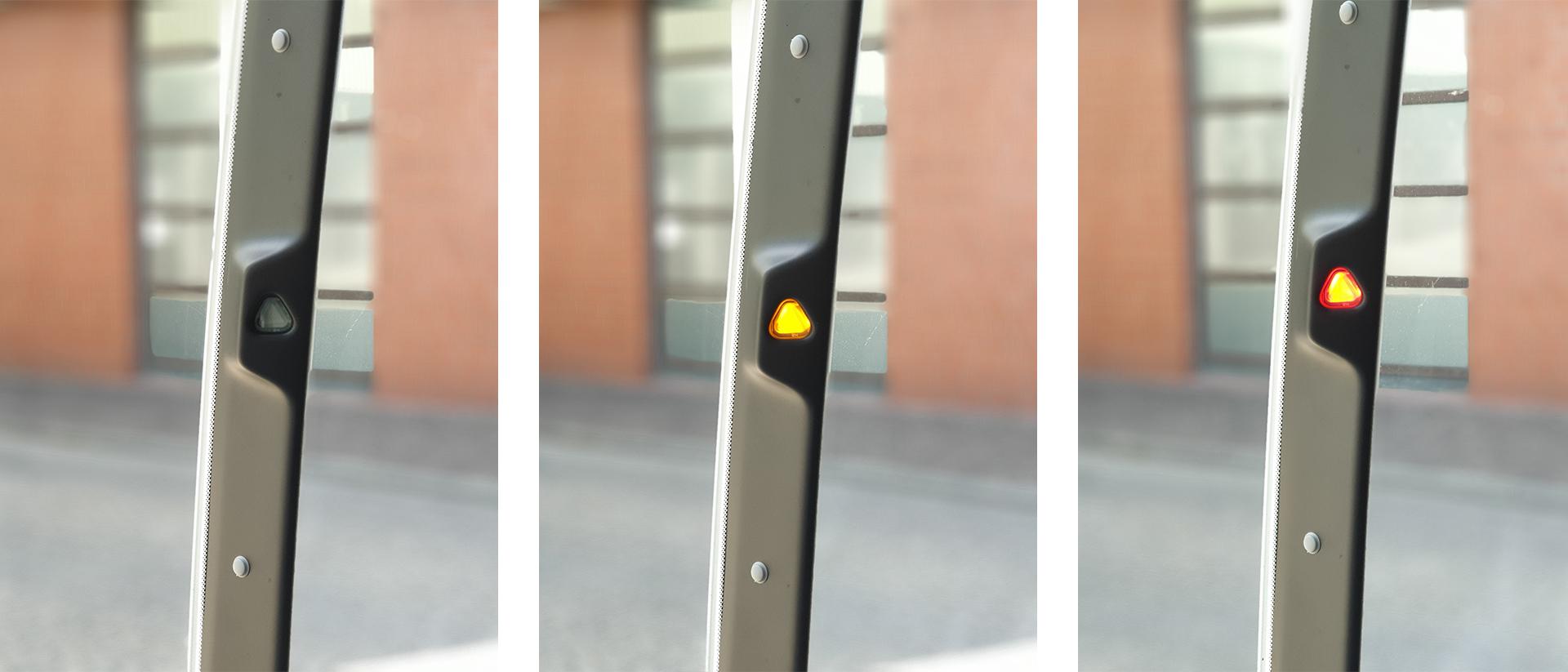 Der Totwinkelassistent signalisiert dem Fahrpersonal visuell, sobald sich ein Objekt im Gefahrenbereich befindet. Ein gelbes Leuchten weist auf ein Objekt neben dem Fahrzeug hin, ein gelbes Leuchten mit rotem Blinken zeigt an, dass das Objekt sich mittlerweile sehr nah im Gefahrenbereich befindet.