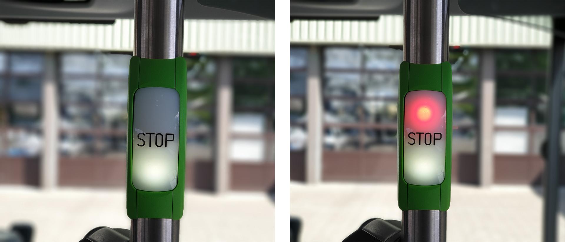 Die neuen Haltewunschtaster sind stets weiß beleuchtet. Sobald der Fahrgast gedrückt hat, wird der aktive Haltwunsch durch Aufleuchten einer roten Lampe signalisiert.