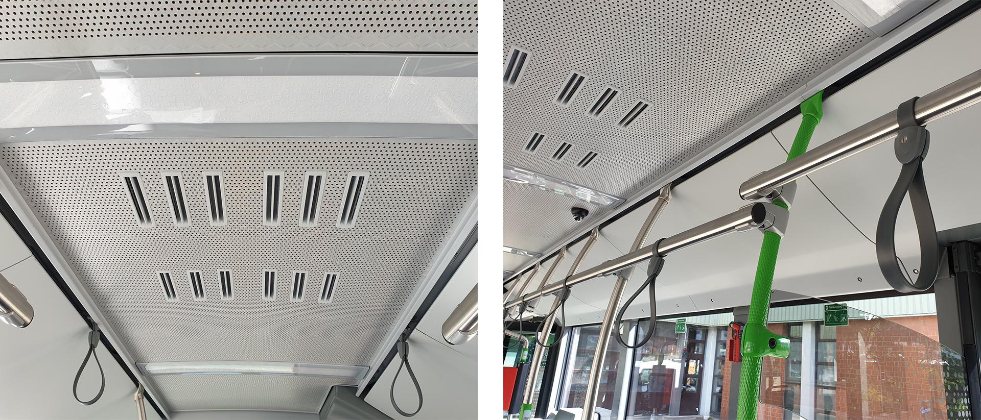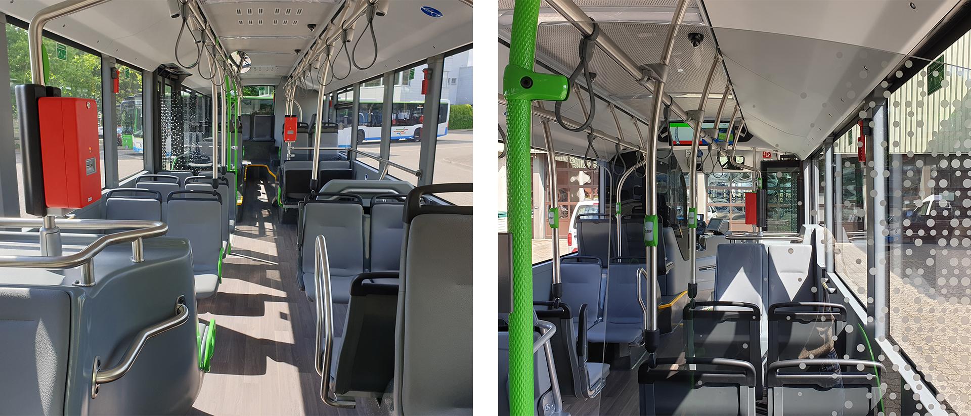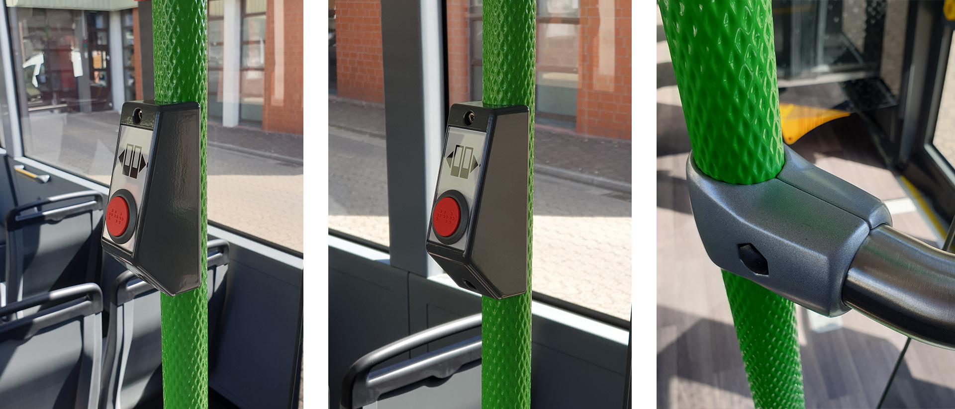 Um allen Fahrgästen die Position der Ausstiege zu signalisieren, wurden die Haltestangen im Ausstiegsbereich Grün gestaltet. Passend zu den Edelstahl-Stangen gibt es die Verbindungsstücke nun in silbrig-metallischer Optik.