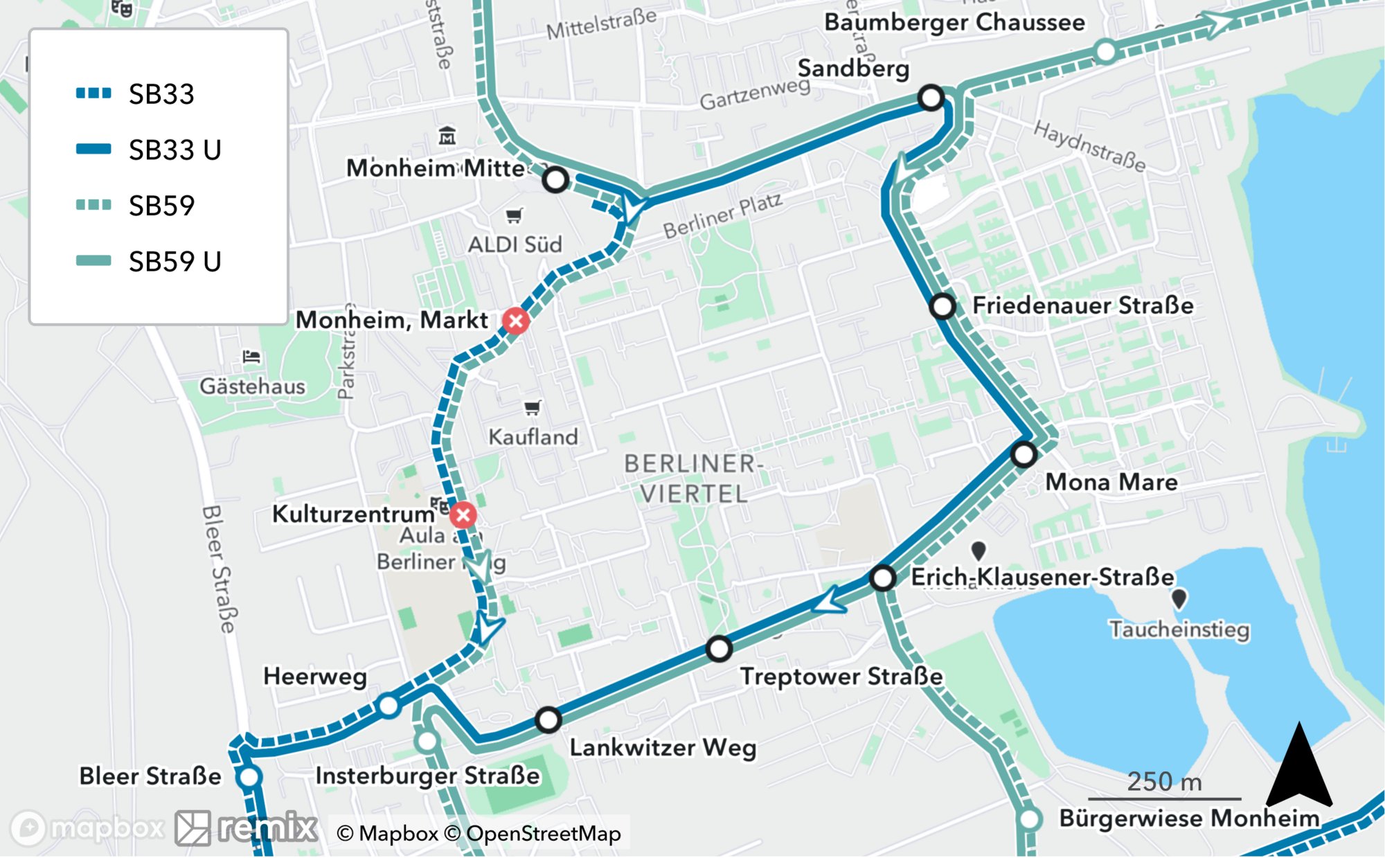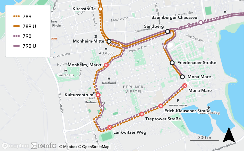 Die Haltestellen „Monheim, Markt“, „Kulturzentrum“, „Lankwitzer Weg“, „Treptower Straße“ und „Erich-Klausener-Straße“ werden aufgehoben. Alle Fahrten enden an der Haltestelle „Mona Mare“.