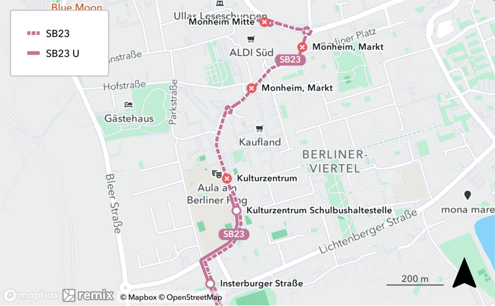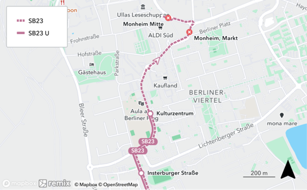 Linie SB23 in Fahrtrichtung Monheim Mitte
