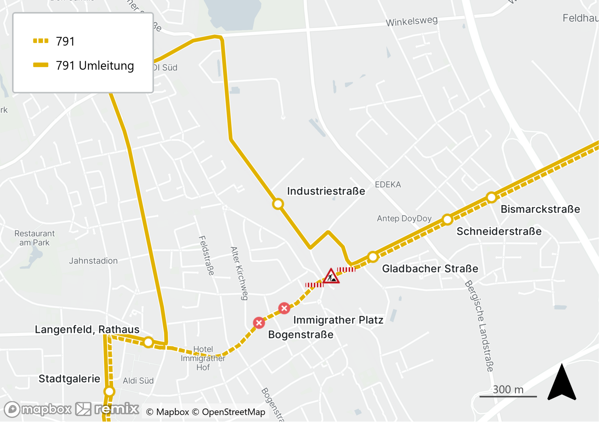 Vom 2. August 2025, Betriebsbeginn, bis zum 4. August 2025, 5 Uhr morgens, wird die Solinger Straße in Langenfeld in beide Fahrtrichtungen wegen Bauarbeiten gesperrt. Am 4. August werden morgens nur die ersten zwei Fahrten der Linie 791 umgeleitet. Ab 5 Uhr fahren die Busse wieder wie gewohnt.