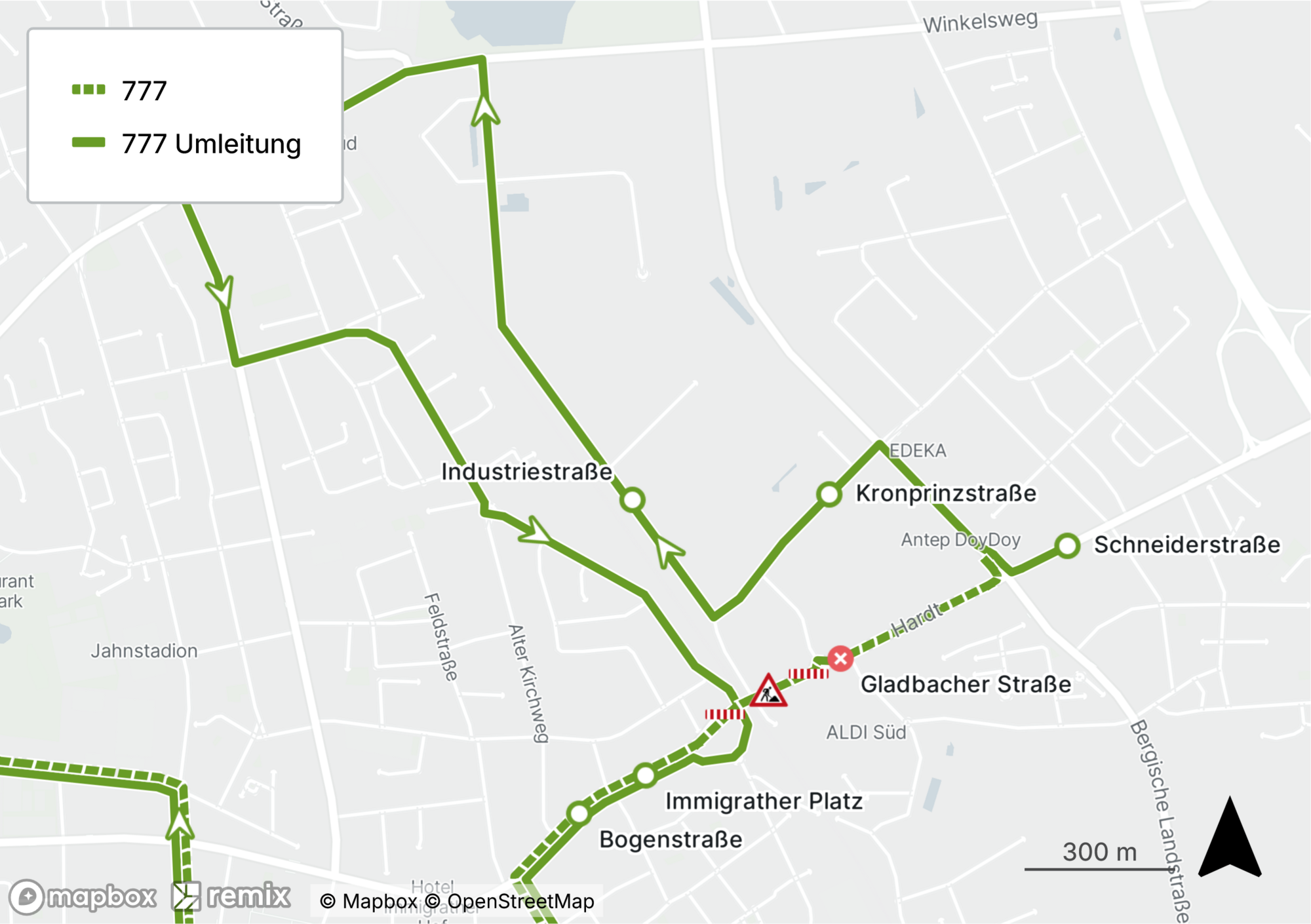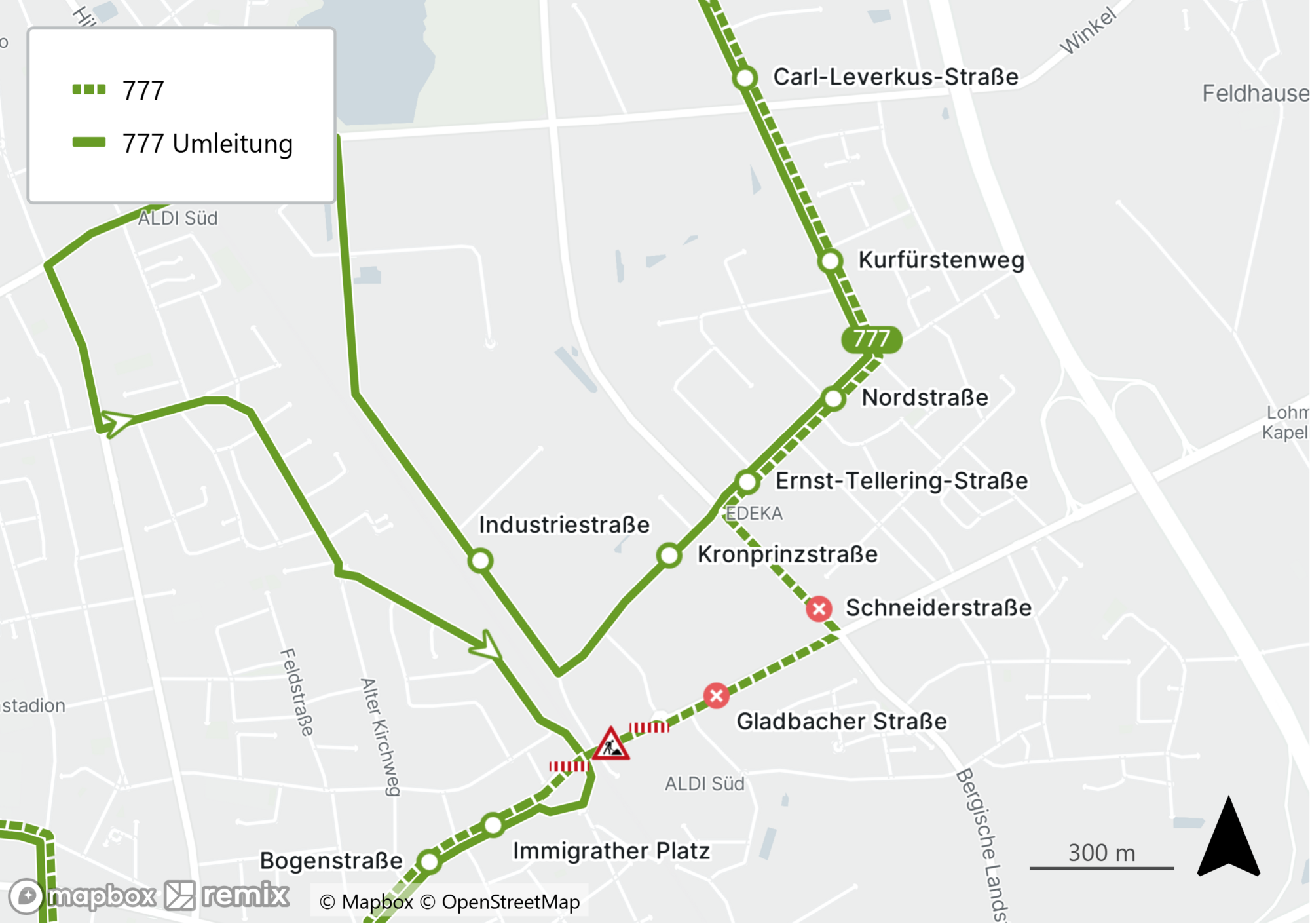 Am Samstag werden die Haltestellen „Gladbacher Straße“ und „Schneiderstraße“ aufgehoben. Stattdessen halten die Busse an den Haltestellen „Industriestraße“ und „Kronprinzstraße“.