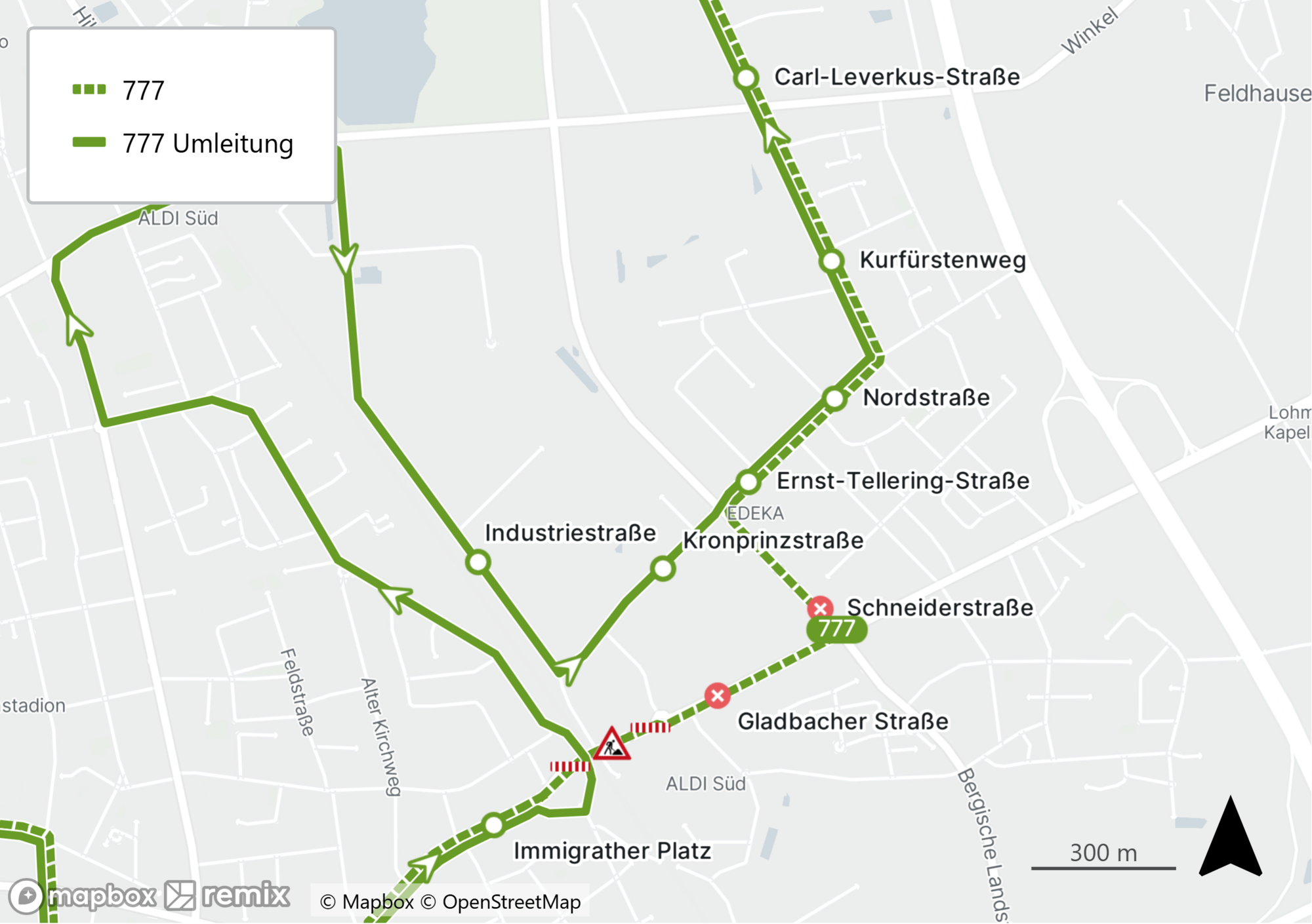 Alle Fahrten, die an der Haltestelle „Langenfeld, Götsche“ beginnen, fahren an den Haltestellen vor der Umleitung 6 Minuten früher ab. Ab der Haltestelle „Immigrather Platz“ fahren die Busse wieder zur regulären Zeit.